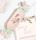 O invitaţie de nuntă cu forma originală, decorată cu flori colorate în tonuri calde. Accesorizată cu o panglică de culoare mint. Hârtia pe care se tipăreşte textul se rulează şi se introduce în cutia în formă de bomboană.