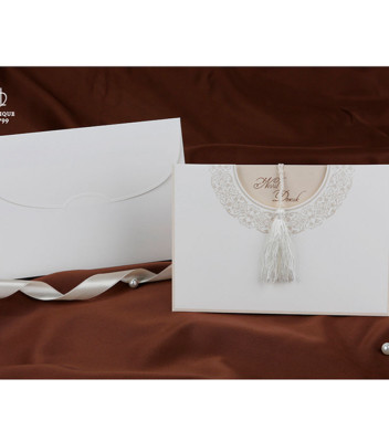 Invitație de nuntă confecționată dintr-un carton alb destinat imprimării textului, accesorizat cu un ciucure alb pentru a ajuta glisarea invitației. Invitația este introdusă într-un carton de tip buzunar ce prezintă un model reliefat argintiu. Atunci cînd invitația este introdusă în buzunar se pot observa imprimate numele mirilor.